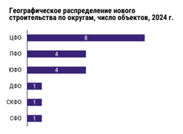 По итогам 2024 г. в регионах России (за исключением Москвы) (было введено в эксплуатацию 19 торговых объектов. Наибольшим числом новых ТЦ «пополнились» Центральный, Приволжский и Южный федеральные округа. В 2025 г. новое строительство будет сконцентрировано в Приволжском ФО, Северо-Западном ФО и Сибирском ФО.
