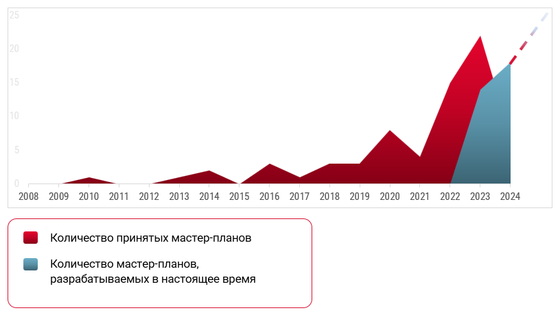 2024 год ознаменовал новый этап развития стратегического планирования городской среды. 29 февраля 2024 года Президент РФ Владимир Путин в обращении к Федеральному Собранию предложил разработать 200 мастер-планов для реализации комплексного развития территорий. Ближайшие несколько лет могут стать рекордными для всей индустрии.
